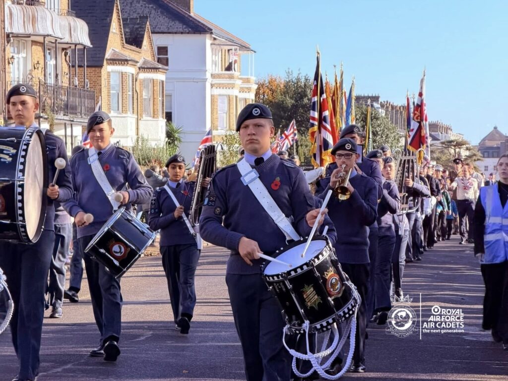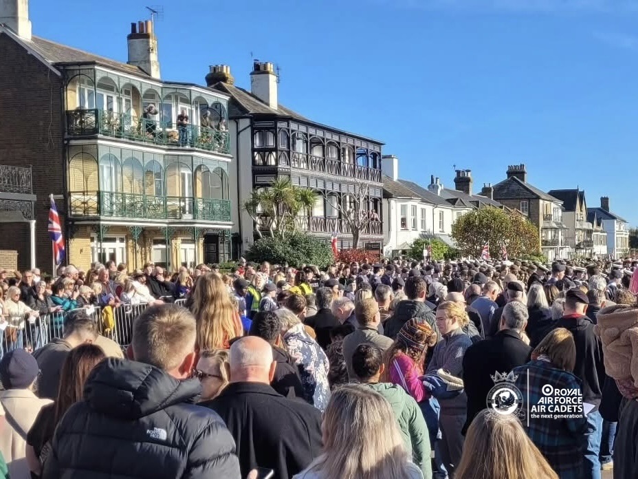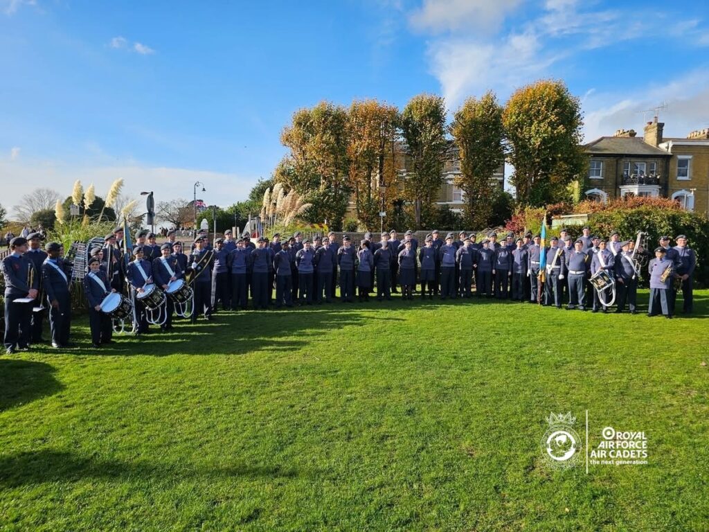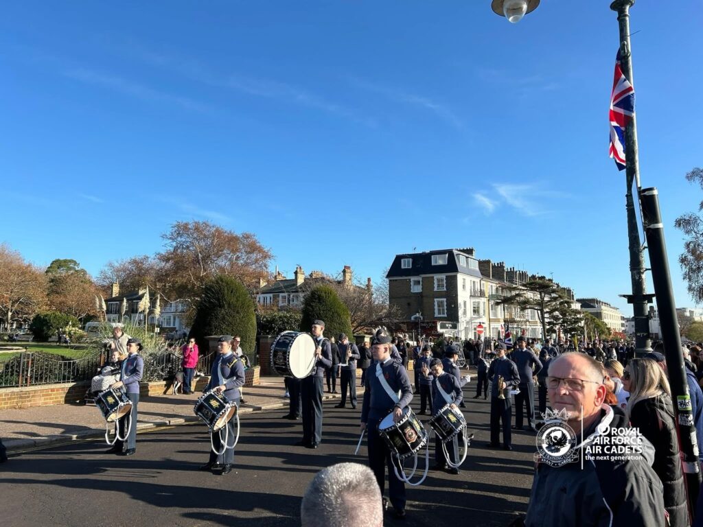 Our Squadron Band led the parade and later the final march-past, and the rest of the Squadron looked outstanding as they formed up alongside all those taking part. The two-minute silence, marked by the chimes of Big Ben, the Last Post, and an artillery gun salute, was a particularly moving moment, followed by hymns, readings, and the laying of wreaths.